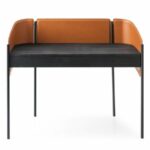 BIBLIO is a contemporary home-office desk that exudes a subtle retro charm. It showcases a tubular metal frame, a wooden top, upholstered privacy panels, and a concealed storage drawer.