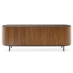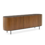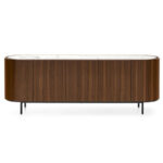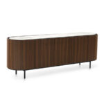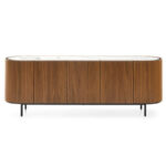The LAKE sideboard is a standout living-area piece characterized by its sleek and harmonious lines. Elevated on a raised base, it features an elegant oval shape, and its beauty is accentuated by the ceramic top, cleverly set slightly back from the edge. This design creates a convenient space between the door and top, making it easy to open the doors and drawers. With veneering all over, the LAKE sideboard is versatile and suitable for a variety of uses.