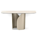 The Twins console, inspired by its namesake table, features gracefully curved metal elements that support a top with rounded corners. Available in a variety of finishes, this console can be customized to suit any style. Its compact dimensions make it an ideal choice for functional and transitional spaces, adding a touch of elegance and practicality.